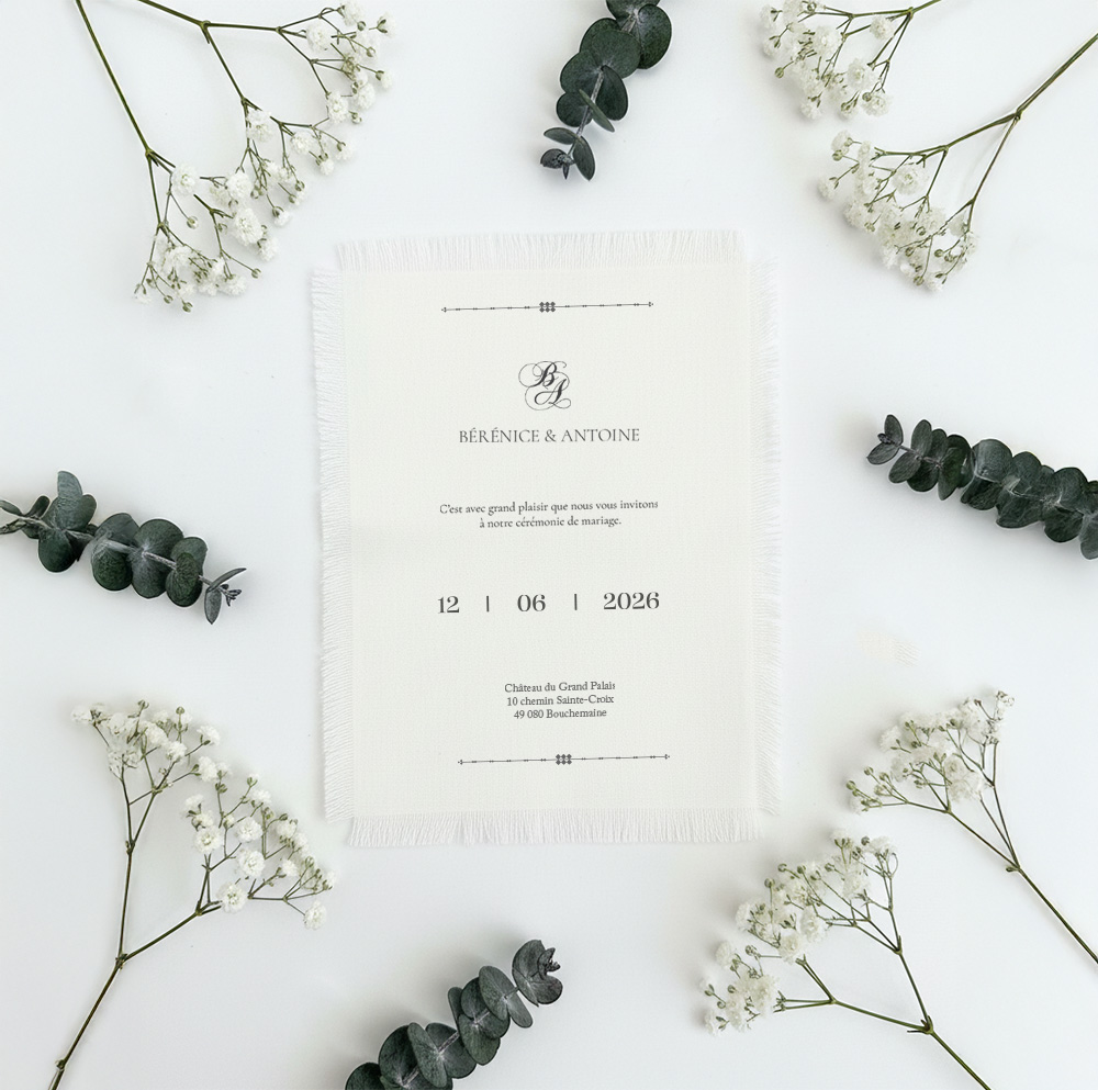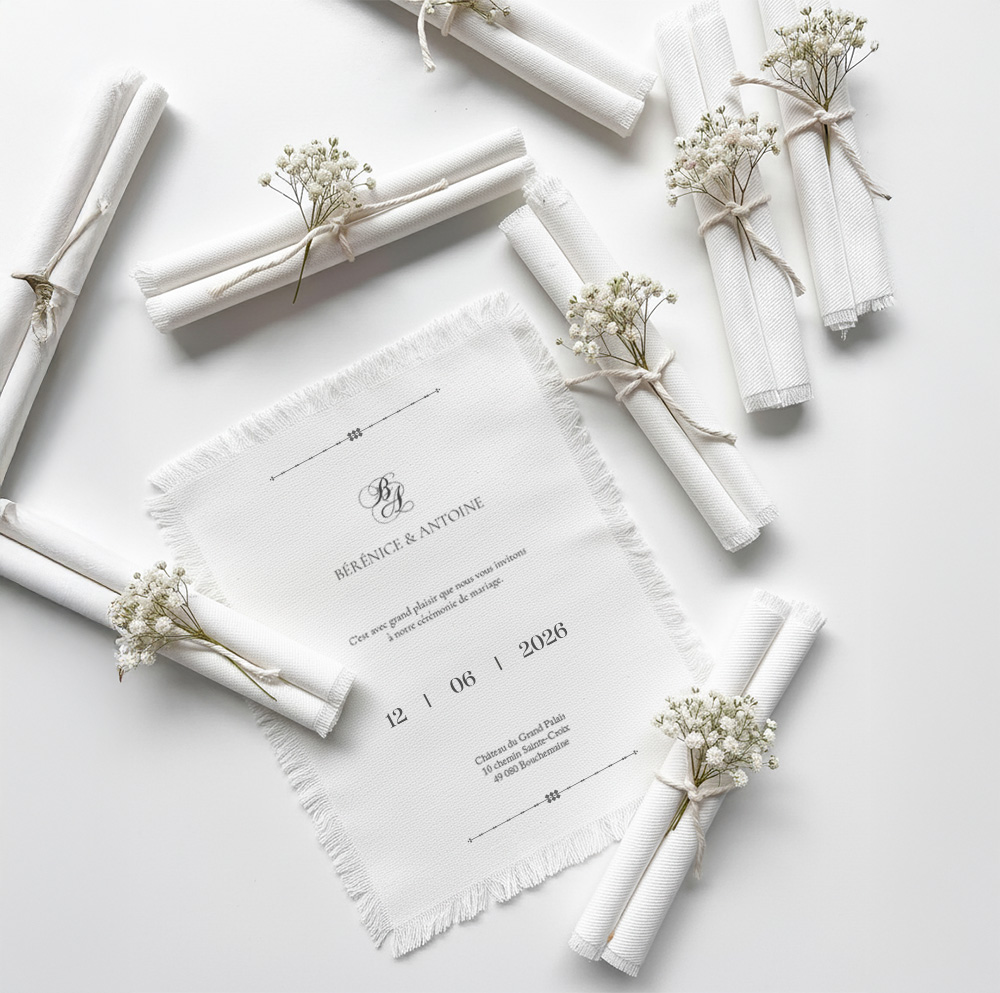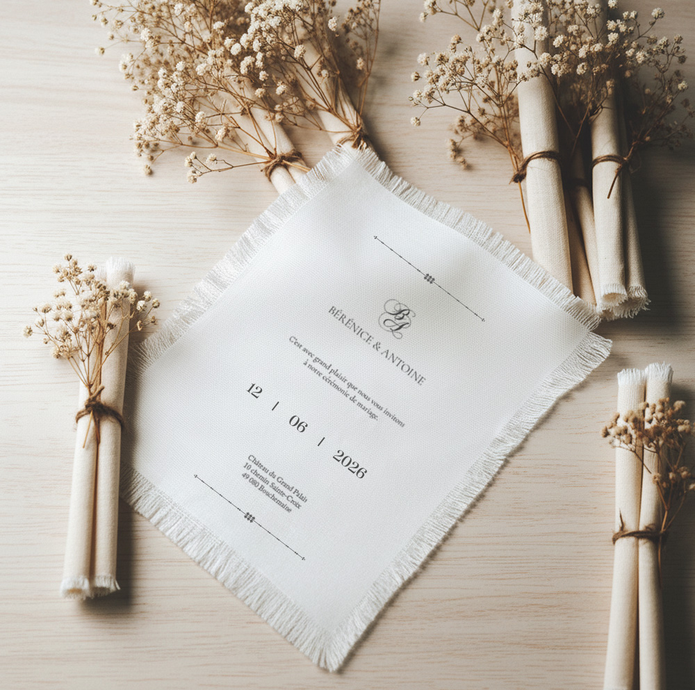 Choisir un faire-part en tissu permet d’affirmer une esthétique singulière et soignée, en rupture avec les formats papier plus classiques. Les finitions, telles que les bords frangés, renforcent l’aspect authentique et artisanal du support, tout en conservant une élégance intemporelle. L’impression textile offre un rendu doux et subtil, particulièrement adapté aux designs épurés et aux compositions graphiques équilibrées.