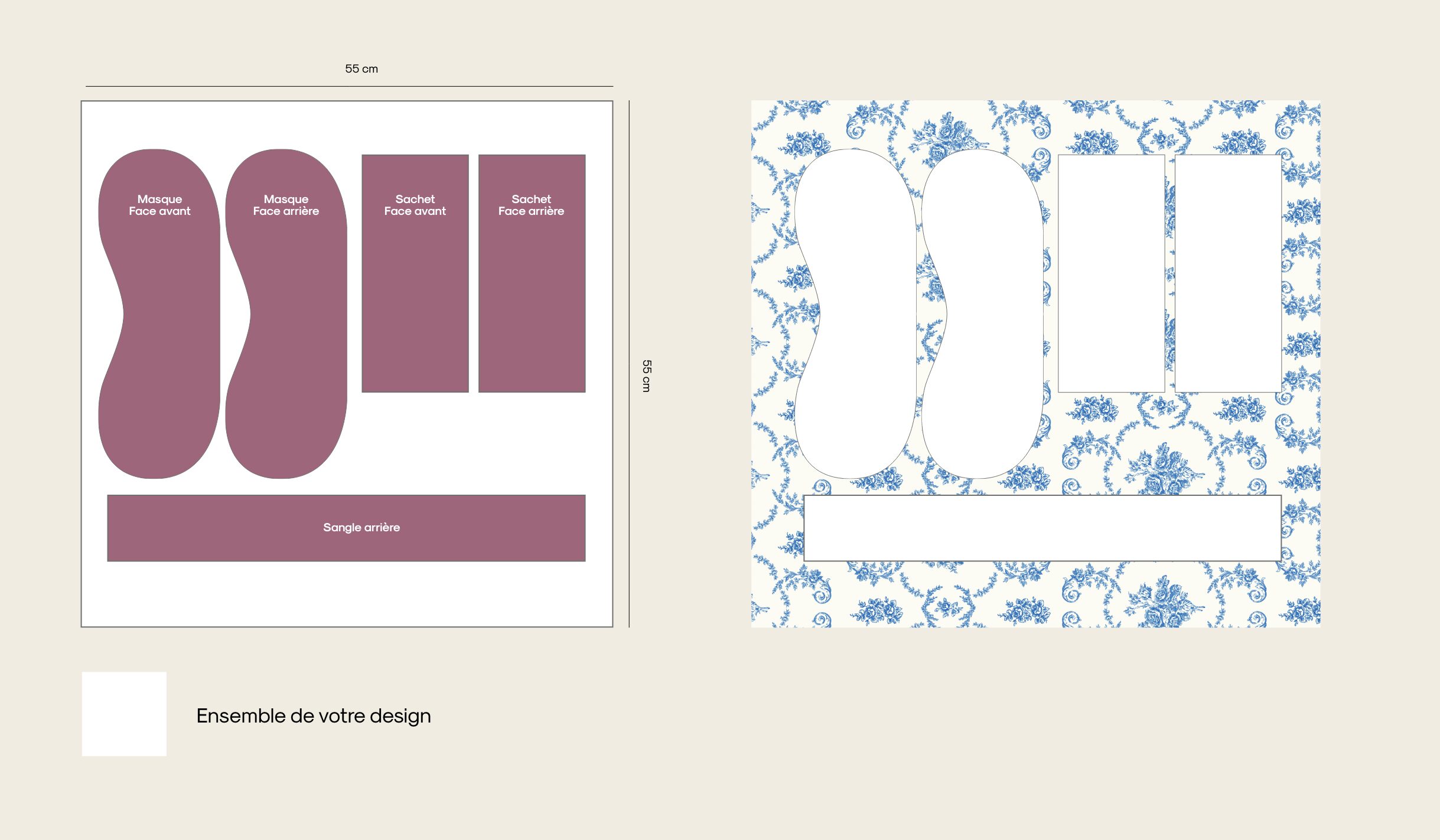 Ces éléments sont découpés dans un fichier unique de 55 × 55 cm que vous devez fournir. Le visuel doit couvrir toute la surface. Il n’est pas possible de positionner un motif à un endroit précis.